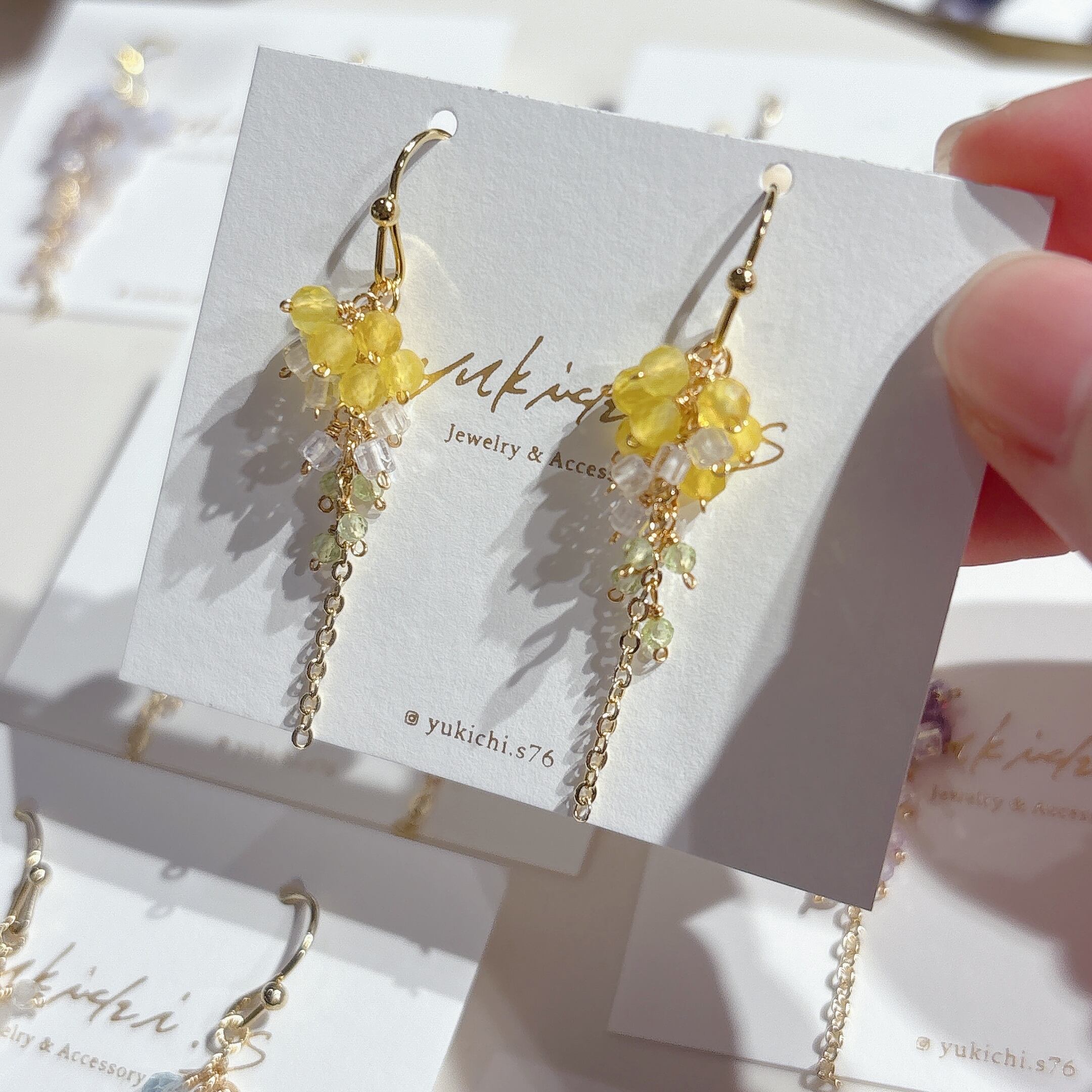 ミモザカラーのイエローカルセドニーが特徴的なピアスです☺️