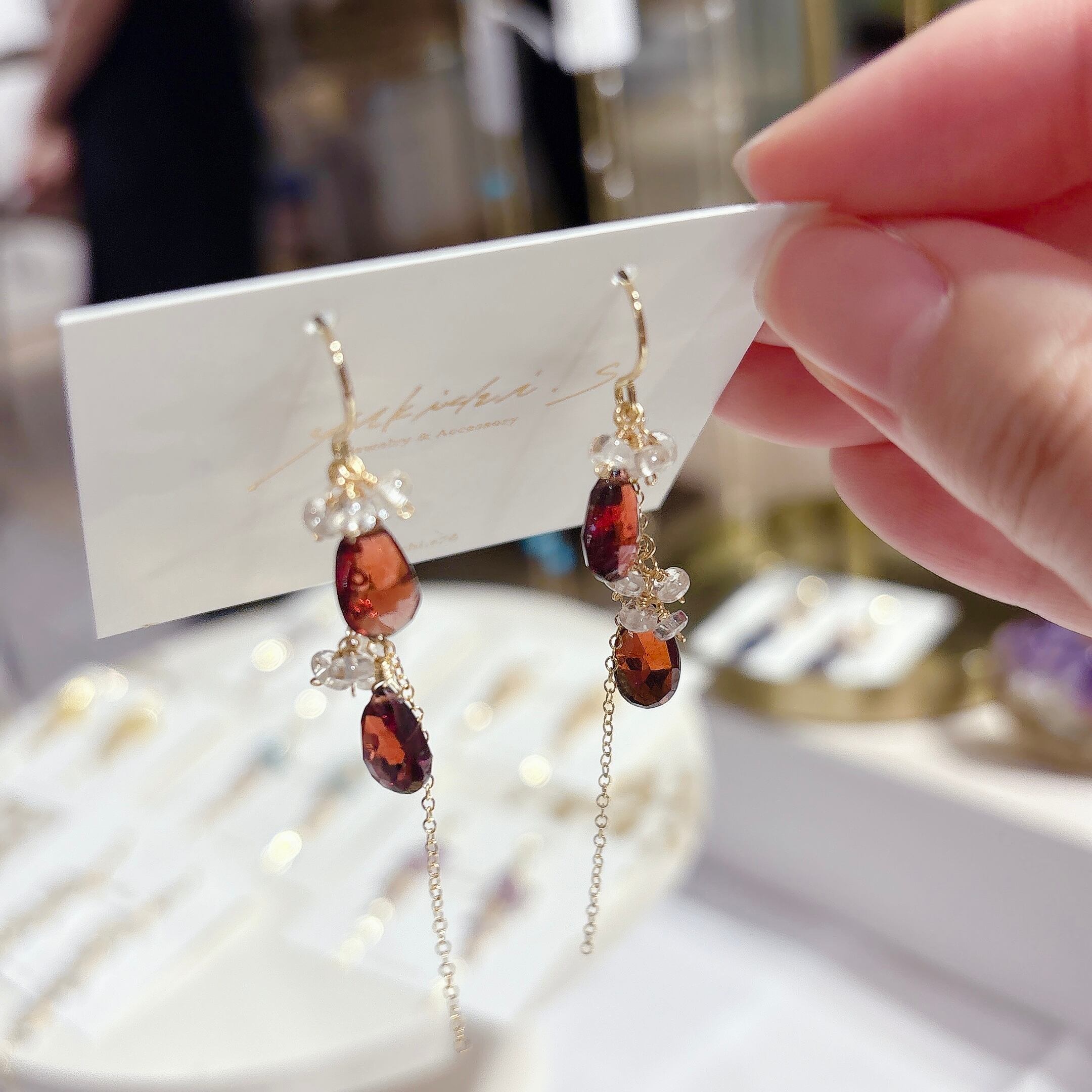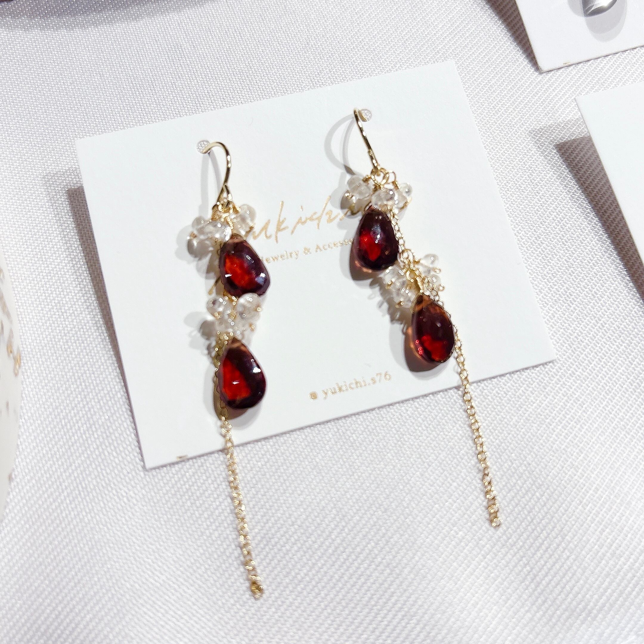 ペアシェイプのガーネットにうるうるホワイトジルコンを組み合わせたロングピアスです!